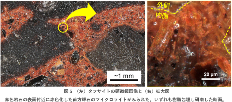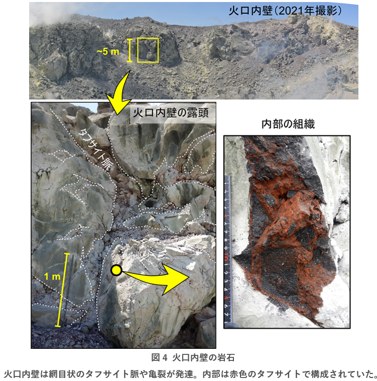 個々の岩石が表面のみ赤色酸化していた理由もこの蓋のモデルで説明できます。地表より地下のほうが圧力が高く、圧力勾配により火口からはつねに火山ガスが流出するので、通常、それをさかのぼって大気が侵入することはありません。しかし、火山ガス流出が停止すれば大気は浸透することができます。このことから、赤い岩石の存在は、蓋の深部でのタフサイトの溶結により一時的に火山ガス流路が閉塞されていたという考えを支持します。さらに、酸化が起こった場所と成因から、赤い火砕物が示す噴火のプロセスを推定できます。火口内壁、すなわち「吹き飛ばされず残された浅部の“蓋”」に赤色酸化したタフサイトが確認され(図4)、またその微細な組織から、岩石が割れたあとに酸化が起こったことがわかりました。噴火は非常に還元的なマグマと酸化的な大気が接触する現象ですが、「マグマが火道を上昇し、割れ、爆発的に地表にもたらされ、大気中を輸送され、広範囲に堆積する」といった、物理化学的条件が急激に変化する一連の噴火のプロセスのうち、どの段階で火砕物と大気が反応するのかほとんどわかっていませんでした。本研究により、ブルカノ式噴火において赤色火砕物は、マグマの上昇中でも地表での輸送・堆積中でもなく、繰り返し爆発を起こす火口の“蓋”の一部としてとどまっている間に数日かけて形成された火砕物だったと推定されました。
