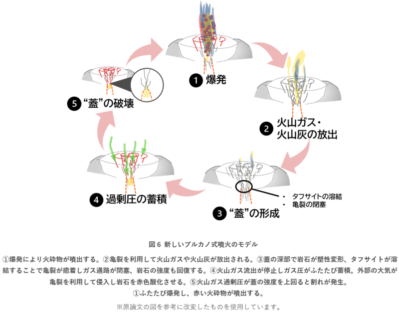 以上のように、浅部と深部で異なる物質的性質をもつ蓋を想定し、亀裂の形成と癒着という素過程を考えることで、爆発が繰り返し起こるメカニズムとそれに伴う噴出物組織の特徴を精緻に説明することができました。