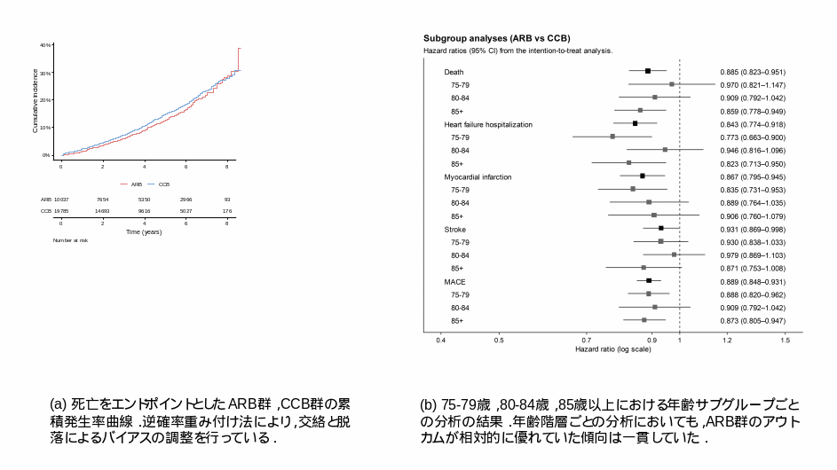 アンジオテンシン受容体拮抗薬(angiotensin receptor blockers; ARB)とカルシウム拮抗薬(calcium channel blockers; CCB)は、いずれも血圧を効果的に低下させる薬剤であり、我が国において、高齢者に対して最も多く処方されている高血圧治療薬です。それぞれ異なる作用機序によって血圧を低下させる薬剤であり、特に、高齢者においては、それらの機序の違いが、単なる血圧低下を超えて、死亡や心疾患など、臨床的に重要なアウトカムの差として現れる可能性があります。国際的なガイドラインなどでも、これらの薬剤は、しばしば同等の選択肢とみなされてきましたが、それらの比較についてのエビデンスの確立が望まれていました。