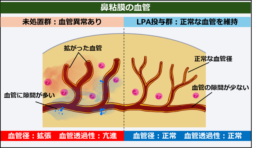 アレルギー性鼻炎マウスの鼻粘膜血管において、未処理群では血管の拡張と内皮細胞間隙の増大により血管透過性が亢進します。一方で、LPA(リゾホスファチジン酸)投与により血管径および内皮細胞同士の結合が維持され、血管透過性は正常に保たれることが分かりました。