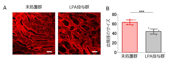 アレルギー性鼻炎のマウスにLPAを投与したところ、炎症によって広がっていた鼻の血管が正常なサイズに縮小しました。(A)血管内皮細胞のマーカーであるエンドムチンを免疫染色した鼻腔内血管の顕微鏡画像(左:未処置群、右:LPA投与群)。赤く染まった部分が血管で、LPAの投与によって血管が細くなっていることが視覚的に確認できます。(B)血管の太さを数値で比較したグラフ。LPA投与群では統計的に有意な血管径の縮小効果が確認され、アレルギー性鼻炎の症状の改善につながる新しい治療法の可能性を示しています。