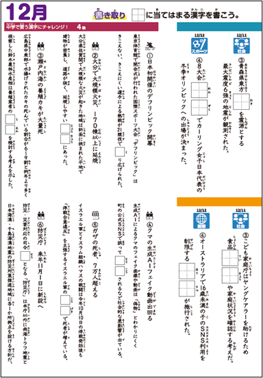 ニュースと漢字学習を結びつけた学習コンテンツとして、「ニュースで漢字ドリル(プリント版)」を毎週 末に配信いたします。